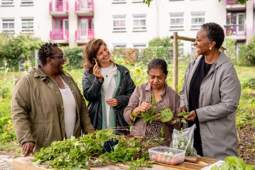 Bloei & Groei is een community van pionierende vrouwen die stadstuinen creëren als Healing- en Community Gardens, vooral in buurten waar dit het hardst nodig is. Groene oases waar veerkrachtige vrouwen kunnen bloeien. Onze oogst gaat verder dan biologische maaltijden – kruiden en planten worden gebruikt in workshops en ambachtelijke producten. Wat begon als een droom, groeide uit tot een beweging van honderden vrouwen die samen de helende kracht van de natuur ervaren. Foto: Renata Chede.