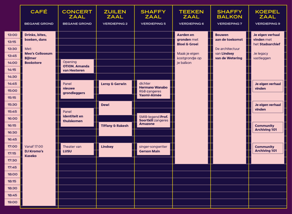 Tijdens deze festivaldag delen zij hun verhalen en visies. Van de Creools-Javaanse Leroy en de Creoolse Gerwin die BONI GYM, een legendarische boksschool in Amsterdam, nieuw leven inblazen als symbool van kracht en gemeenschap. Tot de Surinaams-Javaans-Hindoestaanse Tiffany en Rakesh van Papa Aswa, die cassave verbouwen en er met trots hun eigen cassavefriet van maken, een ode aan traditie én toekomst. Van de Javaans-Surinaamse Dewi die met haar theatergroep Lusu ruimte schept voor verhalen die te vaak onderbelicht bleven, tot de Hindoestaans-Nederlandse architect Lindsey die diep in het Surinaamse binnenland een ziekenhuis ontwerpt voor een inheems dorp. Met optredens, panels en bijdragen van Amanda van Hesteren, Sagid Carter, Gerson Main, Otion, Guillaume Philibert, Bloei & Groei, Professor Soortkill, Kromo’s Kaseko, theatergroep Lusu, Hermano Wanabo, Gianluca Koeswanto, Meo’s Colosseum, Patricia Cronie en vele anderen.