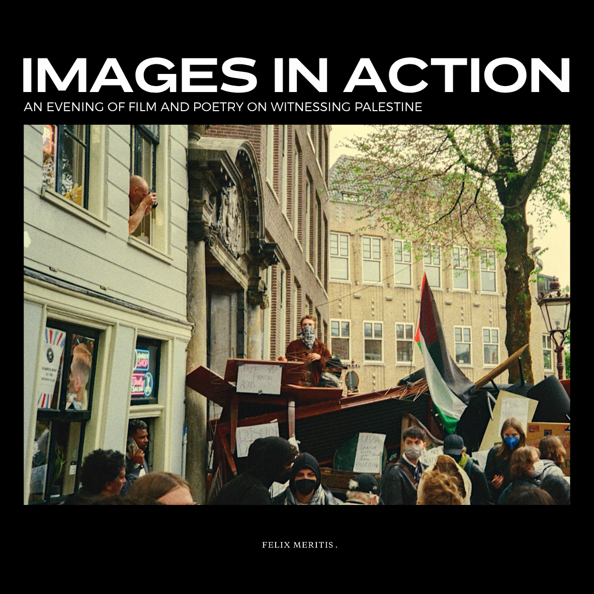 How to bear witness to a world that burns before our eyes? Explore with us as we move between screen and street, between images and words, through film and poetry that emerged from the political struggle in solidarity with Palestine, here in Amsterdam.