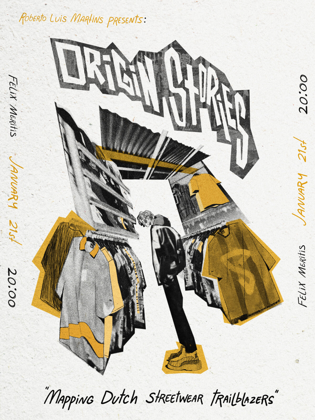 Origin Stories is een serie gesprekken, gehost en gecureerd door Roberto Luis Martins, waarin hij in de origin stories duikt binnen the culture. Centraal staan mensen die aan de basis stonden, trailblazers van het eerste uur. De eerste editie, Mapping Dutch Streetwear Trailblazers, blikt terug op de vroege dagen van streetwear in Nederland. Op wiens schouders rust de huidige scene? Welke verhalen dreigen in de vergetelheid te raken? En welke hedendaagse legendes verdienen een plek in het collectieve geheugen?