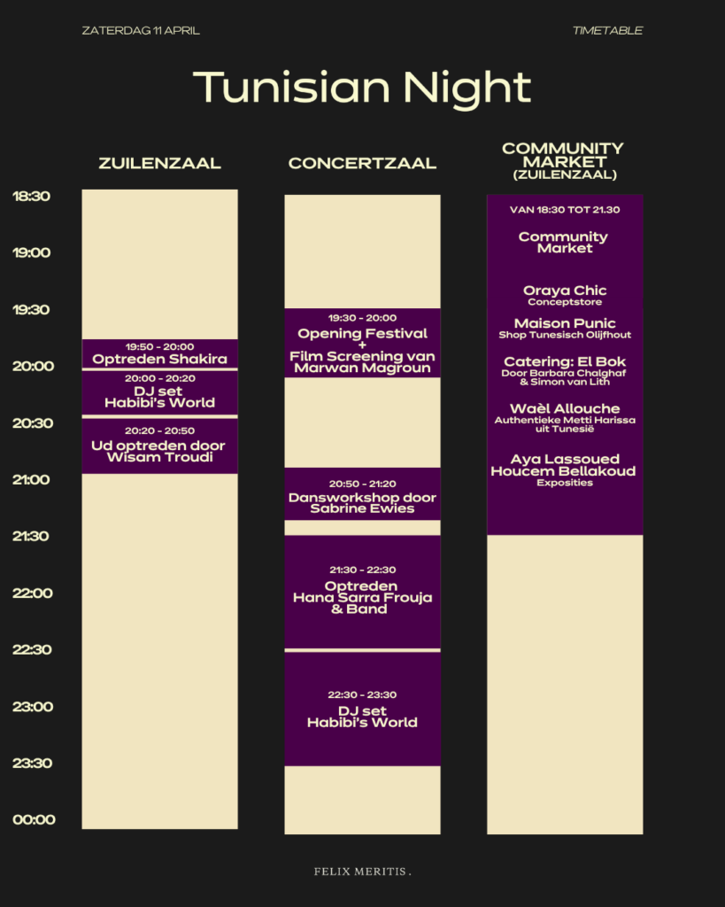 Na een uitverkochte eerste editie keert Tunisian Night terug naar Felix Meritis. Op zaterdag 11 april brengen we een nieuwe generatie Tunesische makers samen die vanuit Nederland werken en creëren. In dans, film, live muziek en beeld vertellen zij verhalen over afkomst, beweging, herinnering en toekomst.