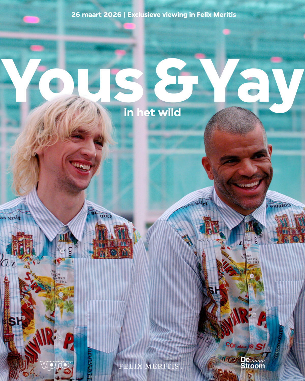 Deze avond is een samenwerking tussen Felix Meritis, De Stroom en VPRO. Yous & Yay in het wild is een coproductie van De Stroom en VPRO. Yous & Yay in het wild, is een serie van vijf afleveringen en vanaf zondag 22 maart, 22.15 uur, te zien op VPRO, NPO 3 en NPO Start.